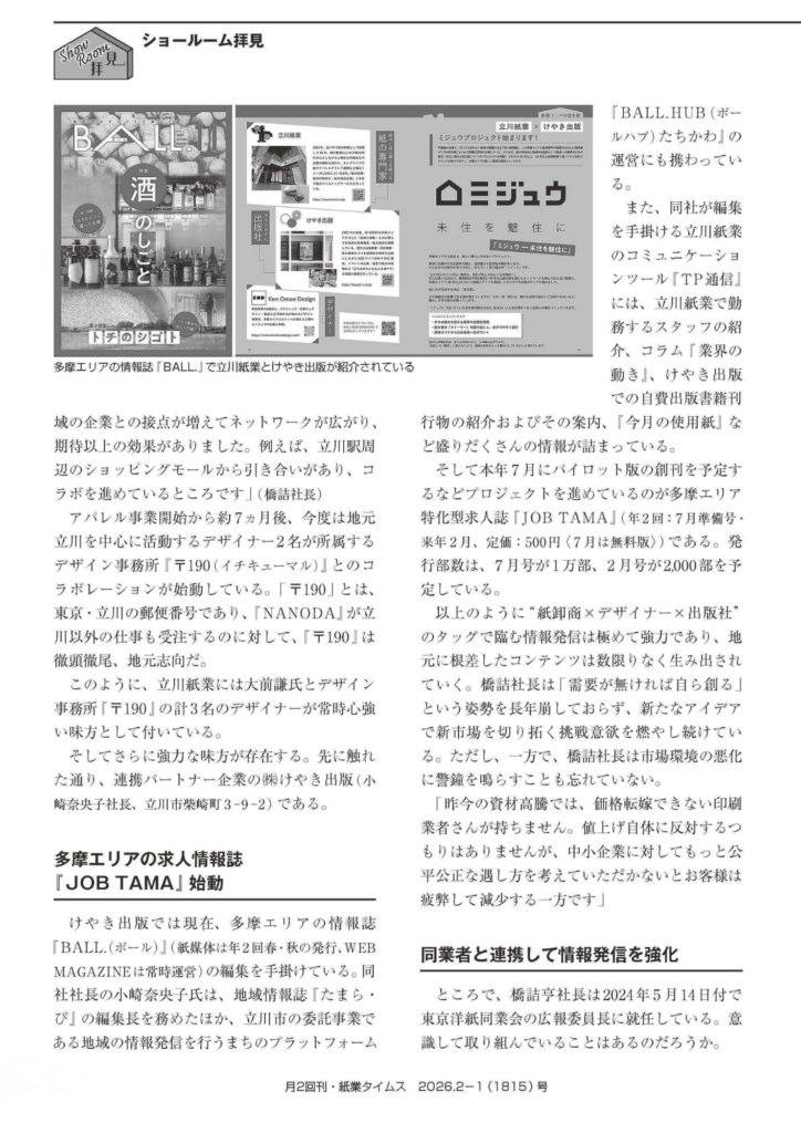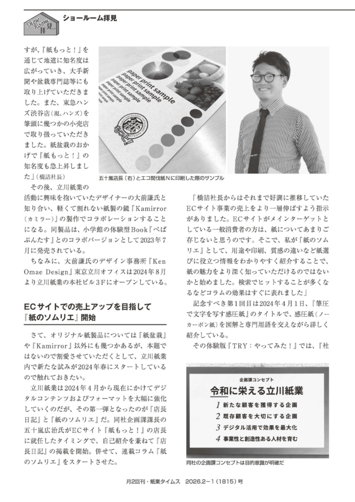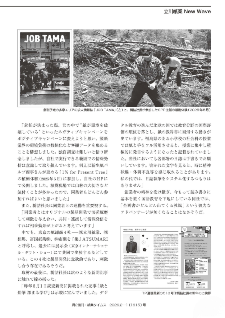 お知らせ(NEWS)紙業界NEWS NANODAメディア掲載地域連携新規事業立川市立川紙業紙のソムリエ紙の卸商社紙もっと!紙業タイムス 【メディア掲載】「紙業タイムス」にて、立川紙業の新たな挑戦を特集していただきました! お知らせ(NEWS) 2026.02.18 「多様なコンテンツを自ら創り出す―“紙卸商×デザイナー×出版社”の比類なき最強の情報発信」 記事では、弊社代表・橋詰のインタビューを中心に、立川紙業が今まさに変革している姿をご紹介いただいています。 目次 「企画書がどんどん出てくる社風」の秘密デジタル×紙の融合「紙のソムリエ」多摩の出版社「けやき出版」とのコラボレーション「紙」の可能性を信じて、次の一歩へ【掲載情報】最近の投稿 「企画書がどんどん出てくる社風」の秘密 創業者の教えである「読み書き(国語教育)」を大切にし、社員一人ひとりがインプットとアウトプットを繰り返すことで生まれる、弊社の創造的な社風について。ものづくりへの挑戦の転機となった『紙盆栽』や、デザイナー大前謙氏とのコラボレーションによる鏡のような紙『Kamirror(カミラー)』の誕生秘話。 デジタル×紙の融合「紙のソムリエ」 ECサイト「紙もっと!」の店長・五十嵐が手掛ける、紙の魅力をプロの視点で伝える新連載の裏側。SNS・Webを活用しての積極的な情報発信、新事業「NANODA」と地域連携など 多摩の出版社「けやき出版」とのコラボレーション 2025年より始動したアパレル事業や、地元の出版社「けやき出版」様、デザイナー様たちとタッグを組んだ多摩エリアの情報発信(JOB TAMA等)について。 「紙」の可能性を信じて、次の一歩へ 記事の最後では、代表の橋詰が同業他社との連携や、デジタル化が進む現代における「手書き」や「紙の教科書」の価値についても語っております。私たちが目指しているのは、単に紙を卸すことではありません。紙という素材を軸に、デザインや編集の力を掛け合わせ、地域や社会に新たな価値を届ける「情報発信基地」となることです。今回の掲載を励みに、スタッフ一同さらに面白い企画、ワクワクする商品をお届けできるよう邁進してまいります! 【掲載情報】 媒体名: 月2回刊 紙業タイムス(紙業タイムス社) 発行日: 2026年2月1日(第78巻第3号) コーナー名: ショールーム拝見「立川紙業 New Wave」 最近の投稿 【メディア掲載】「紙業タイムス」にて、立川紙業の新たな挑戦を特集していただきました! TP通信 513号 TP通信 512号 【出展告知】『諏訪の森MARKET 秋祭り(11.2)』に参加します! TP通信 511号 TP通信 510号 地元・立川から生まれたアパレルブランド『〒190』|地域と人をつなぐ 【出展告知】『諏訪の森MARKET 夏祭り(7.12)』に参加します! LIMEX Sheet ECサイト『紙もっと!』 TP通信 509号 Instagram X-twitter Facebook Youtube Line