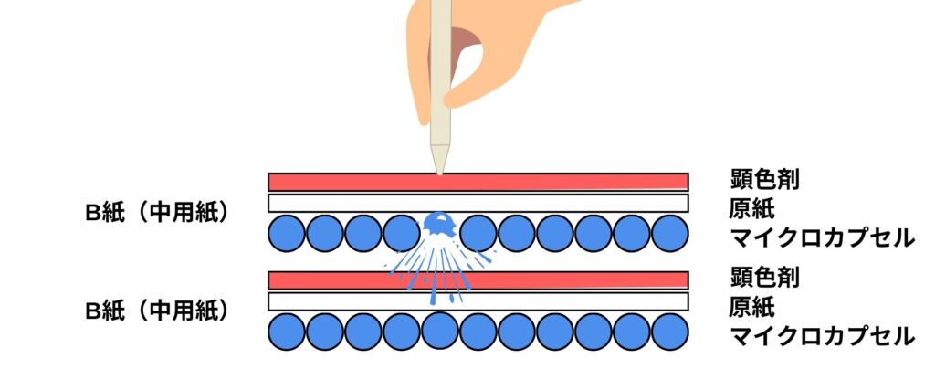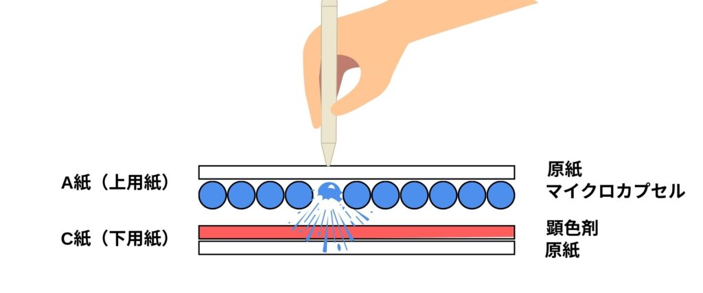 紙のソムリエ ノーカーボン紙帳票用紙感圧紙感圧紙 プリンター感圧紙 富士フィルム感圧紙とは紙もっと!複写伝票 複写に便利な定番用紙『感圧紙』 紙のソムリエ 2025.12.18 筆圧で複写できる便利な用紙「感圧紙」 見積書や納品書、請求書など、その場で複写が必要な伝票類 に欠かせないのが「感圧紙」です。カーボン紙を挟まずに複写できるため、作業性が高く、業務現場では長年定番として使われてきました。この記事では、感圧紙とは何か という基本から、感圧紙とプリンターの関係、富士フィルム製感圧紙の特長 までを整理してご紹介します。 目次 感圧紙とは?感圧紙の仕組み感圧紙とプリンターの関係感圧紙 富士フィルムの特長セット糊とは?最近の投稿 感圧紙とは? 感圧紙とは、紙に加わる圧力によって発色し、下の紙へ内容を複写できる特殊紙のことです。カーボン紙が不要筆圧・印字圧で自動的に複写手書き・印字どちらにも対応伝票・帳票用途に最適一般的には「ノーカーボン紙」とも呼ばれ、複数枚を重ねて使用することで、同じ内容を同時に記録できます。 感圧紙の仕組み 感圧紙の上用紙・中用紙(A・B紙)の裏面に塗布されたマイクロカプセルの中には、油に溶かされた無色の染料が入っています。 この染料が中・下用紙(B・C紙)の表面に塗布された顕色剤と反応することにより、瞬時に安定した発色が得られます。上用紙・下用紙(A・C紙)をご使用になられずに、中用紙(B紙)のみを重ねた組合せでも発色します。 感圧紙とプリンターの関係 最近では感圧紙40番手まで対応可能なプロダクションプリンターも登場しています。感圧紙40番手でも安定した給紙・印字が可能高速出力による業務効率の向上オンデマンド印刷で小ロット対応がしやすい伝票・帳票の内製化が可能にこれにより、感圧紙 × デジタル印刷 という新しい運用スタイルが現実的になりつつあります。ただし、すべてのプリンターが対応しているわけではないため、使用の際は プリンターの対応番手・メーカー推奨条件の確認が必須 です。 感圧紙 富士フィルムの特長 感圧紙 富士フィルム製 は、安定した発色性能と品質の高さで知られています。発色が均一で文字が読みやすい保存性が高く、記録が残りやすい複写ムラが出にくい業務用途での信頼性が高い長期保管が必要な帳票や、正確性が求められる業務伝票に多く採用されています。立川紙業(紙もっと!)では富士フィルム製の感圧紙を皆様へお届けしております。 セット糊とは? セット糊とは、複写伝票の 片側(主に天側)を糊で固めて綴じる加工方法 のことです。用紙をバラけさせずに管理できる使用時に1枚ずつきれいに切り離せる伝票として扱いやすい納品書・請求書・控え伝票に最適感圧紙の特性を活かすうえで、非常に相性の良い仕上げ方法 と言えます。 こちらからご購入いただけます! 株式会社立川紙業五十嵐 広治(いがらし こうじ)日本洋紙板紙卸商業組合 認定「紙営業士」株式会社立川紙業/ECサイト「紙もっと!」管理人紙とともに育ち、紙を愛し、紙の魅力を伝えることを仕事にしています。現在は、株式会社立川紙業にて以下を中心に活動中・ECサイト「紙もっと!」の企画・運営・コーポレートサイト/ブログの制作・更新・InstagramやyoutubeなどSNS運用による情報発信全国の印刷会社・デザイナー・個人ユーザーに向けて紙の楽しさ・奥深さを日々発信しています。 最近の投稿 年末年始の休業のお知らせ TP通信 512号 【出展告知】『諏訪の森MARKET 秋祭り(11.2)』に参加します! TP通信 511号 TP通信 510号 地元・立川から生まれたアパレルブランド『〒190』|地域と人をつなぐ 【出展告知】『諏訪の森MARKET 夏祭り(7.12)』に参加します! LIMEX Sheet ECサイト『紙もっと!』 TP通信 509号 1% for Present Tree植樹体験 Instagram X-twitter Facebook Youtube Line