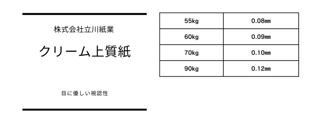 クリーム上質は、厚さ(連量)のバリエーションがシンプルで扱いやすく、主に冊子や資料など「読みやすさ」が求められる用途に適しています。軽やかで扱いやすい55kgから、よりしっかりとした90kgまで、シーンに応じた使い分けが可能です。