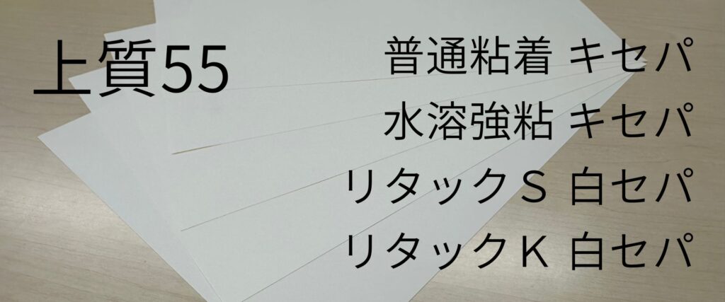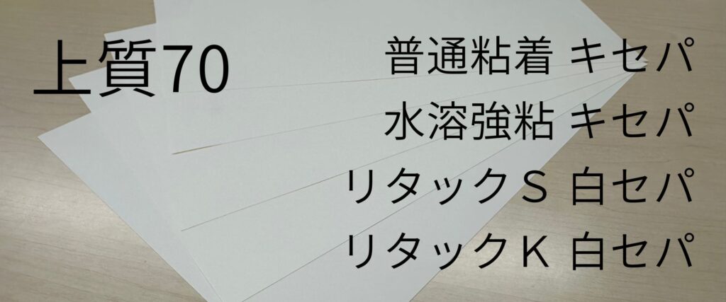 紙のソムリエ シール用紙タック紙上質タック商品ラベル宛名ラベル注意喚起シール白タック紙もっと! 迷ったらこれ『上質タック』 紙のソムリエ 2025.12.17 クセがなく、使いやすい定番シール用紙「上質タック」 「上質タック」は、白色度が高く、紙質にクセのない定番のタック紙です。印刷の安定性と扱いやすさに優れており、商品ラベルから注意喚起シール、宛名ラベルまで、業種や用途を問わず幅広く使用されています。“まずはこれを選べば間違いない” と言える、非常に汎用性の高いシール用紙です。 目次 上質タックとは特徴・質感構成用途まとめ:こんな方におすすめ最近の投稿 上質タックとは 上質タックは、上質紙を基材としたラベル・シール用のタック紙です。白色度が高く、清潔感のある紙面紙質が均一でクセがない印刷・加工がしやすいコストと品質のバランスが良い特別な質感や装飾性はありませんが、その分 用途を選ばず使える万能型 のタック紙です。 特徴・質感 シンプルで清潔感のある白色 商品情報・注意表示・ロゴが見やすい。印刷適性が安定している 文字・ベタ・写真まで幅広く対応。クセのない紙質 業務用途・大量印刷にも向いている。加工・作業性が良い 断裁・抜き加工・貼り作業がスムーズ。コストパフォーマンスに優れる 日常的に使いやすい定番素材。 構成 厚さは2種類で55kgと70kgから選べます!【構成】表面:上質紙(非塗工紙)中層:粘着剤(一般粘着 or 再剥離など)裏面:黄色セパレーター(剥離紙)普通粘着 (キセパ):一般糊、特に指定がない場合は普通糊で黄色のセパレート材を使用 水溶強粘 (キセパ):普通糊より接着力を高めた水に溶ける糊で黄色のセパレート材を使用 リタックS(白セパ):弱粘再剥離糊で貼って剥がせるタイプの糊で白い色のセパレート材を使用リタックK(白セパ):強粘再剥離糊リタックSよりも接着力が糊で白い色のセパレート材を使用 用途 【主な用途】・商品ラベル・注意喚起シール・宛名・管理用ラベル・食品・雑貨の表示シール・社内管理用シール・イベント・キャンペーン用ラベル まとめ:こんな方におすすめ 【デザイン面で相性が良いポイント】・文字情報がくっきり読みやすい・シンプルなデザインと好相性・写真・イラストも無難に再現できる・業務用途で安心して使える【こんな方におすすめ】・まずは使いやすいタック紙を探している方・商品表示や注意表示用のシールを作りたい方・コストと品質のバランスを重視したい方・大量印刷・業務用途で安定した素材を求める方 こちらからご購入いただけます! 株式会社立川紙業五十嵐 広治(いがらし こうじ)日本洋紙板紙卸商業組合 認定「紙営業士」株式会社立川紙業/ECサイト「紙もっと!」管理人紙とともに育ち、紙を愛し、紙の魅力を伝えることを仕事にしています。現在は、株式会社立川紙業にて以下を中心に活動中・ECサイト「紙もっと!」の企画・運営・コーポレートサイト/ブログの制作・更新・InstagramやyoutubeなどSNS運用による情報発信全国の印刷会社・デザイナー・個人ユーザーに向けて紙の楽しさ・奥深さを日々発信しています。 最近の投稿 年末年始の休業のお知らせ TP通信 512号 【出展告知】『諏訪の森MARKET 秋祭り(11.2)』に参加します! TP通信 511号 TP通信 510号 地元・立川から生まれたアパレルブランド『〒190』|地域と人をつなぐ 【出展告知】『諏訪の森MARKET 夏祭り(7.12)』に参加します! LIMEX Sheet ECサイト『紙もっと!』 TP通信 509号 1% for Present Tree植樹体験 Instagram X-twitter Facebook Youtube Line