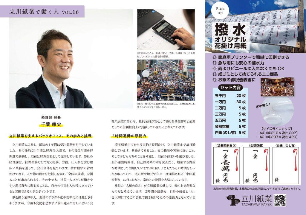 TP通信 510号 TP通信 2025.10.02 目次 地域の印刷文化に貢献する TP通信 510号TP通信 働く人今月の使用紙最近の投稿 地域の印刷文化に貢献する TP通信 510号 今回のTP通信は縁の下の力持ちの経理部長 千葉さんです!今回ご紹介したいのはお祭りで活躍間違いなしの『撥水花掛け用紙』家庭用プリンターで宛名を印刷するだけでお祭りでよく見かける花掛け(寄付)用紙の完成!急な雨にも撥水効果で対応できる優れものです。ECサイト『紙もっと!』では有料ではありますがテストサンプルも販売しておりますのでお気軽にどうぞ今回の使用紙は王子ホールディングスの『OKアドニスラフ80』です! ECサイト『紙もっと!』へ TP通信 働く人 今月の使用紙 最近の投稿 TP通信 511号 TP通信 510号 美しい平滑性と高白色『サンサンケント』 ナチュラルで上品な仕上がり『サンシオン』 落ち着いた質感『モンテシオン』 地元・立川から生まれたアパレルブランド『〒190』|地域と人をつなぐ 【出展告知】『諏訪の森MARKET 夏祭り(7.12)』に参加します! LIMEX Sheet ECサイト『紙もっと!』 TP通信 509号 1% for Present Tree植樹体験 Facebook Youtube Line Instagram